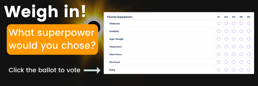 Millions of North Americans gathered with their friends and family to watch the solar eclipse this week. Some folklore says that the solar eclipse can give you superpowers. While the fight to build women’s political power doesn’t need superheroes (just passionate individuals), I want to see how readers rank these powers!