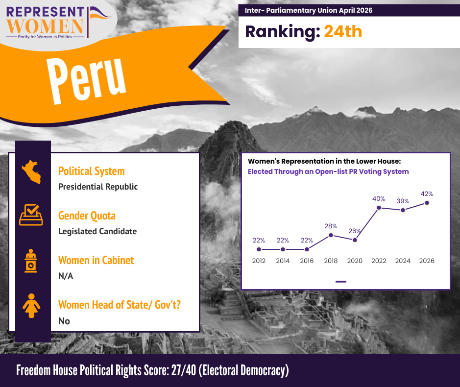 This April, we are watching six elections across four continents, and the range alone tells a story worth paying attention to. In Peru, the first round of the presidential election was held on April 12th and 13th — extended by a day after logistical failures left tens of thousands of voters without ballots. As votes continue to be counted, Keiko Fujimori is leading the first round with roughly 17% of the vote, all but certain to advance to the June 7th runoff. She would be the country's first woman president if she wins — but the second candidate for the runoff remains unclear, with several contenders locked in a tight statistical tie. Peru is a fascinating case study in how electoral systems shape representation: the legislative elections happening alongside the presidential race operate under a 50% candidate quota with placement mandates, helping Peru maintain 41.5% women's representation in its legislature — one of the highest in the region.
