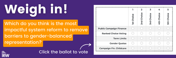Continuing with the theme of solutions to increase women’s representation, which do you think is the most impactful system reform to remove barriers to gender-balanced representation? Let us know with this poll!