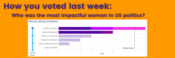 The results from last week’s ranked choice voting poll are in! Readers weighed in on who they thought was the most impactful woman in U.S. Politics, and the majority of voters named Shirley Chisholm!