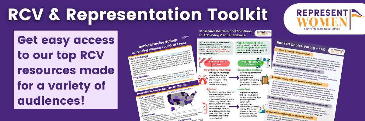 Our Ranked Choice Voting and Representation Toolkit is now live! With this one-stop shop, you'll have instant access to our latest and most impactful resources on RCV and its positive influence on women's representation in government. The best part? You won't need to worry about missing out on updates – our toolkit automatically refreshes, keeping you informed with the most current information. Bookmark the toolkit and empower yourself to speak confidently about RCV's benefits for women's political power.