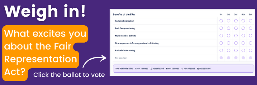 This week, Representatives Don Beyer and Jamie Raskin reintroduced the Fair Representation Act (FRA) to Congress. If passed, the FRA would shift the landscape of American democracy for the better. Let us know what your favorite aspect of the FRA is with this poll!