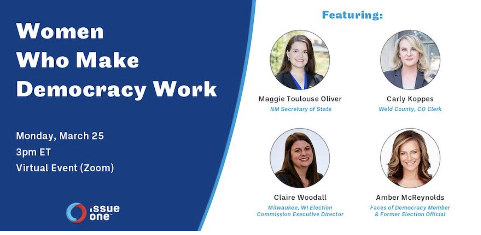 RepresentWomen board member Amber McReynolds & democracy champion Maggie Toulouse Oliver will join a panel of women experts to speak about the Women Who Make Democracy Work, hosted by Issue One, this coming Monday, March 25th at 3pm. Register here.