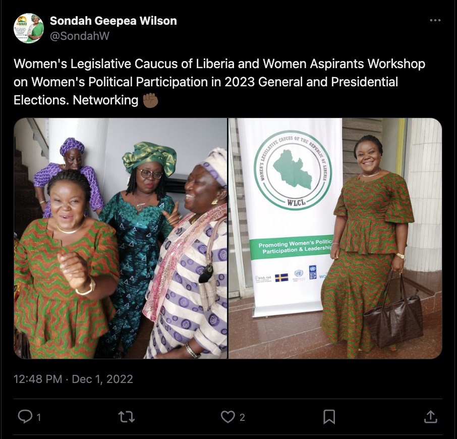 Front Page Africa’s article takes us on a journey through Madam Sondah Geepea-Wilson’s life and how she became the brilliant changemaker she is today. She lived through the Liberian Civil War as a child, leading her to understand the change she believed the country needed, and advocate for women in leadership and. When running for the representative seat in Nimba County, she was met with dissent, her campaign materials were destroyed, and she and her supporters experienced political violence. Although she did not win the seat, she has not resisted the fight. She is currently a campaign coordinator for the National Unity Party Alliance.