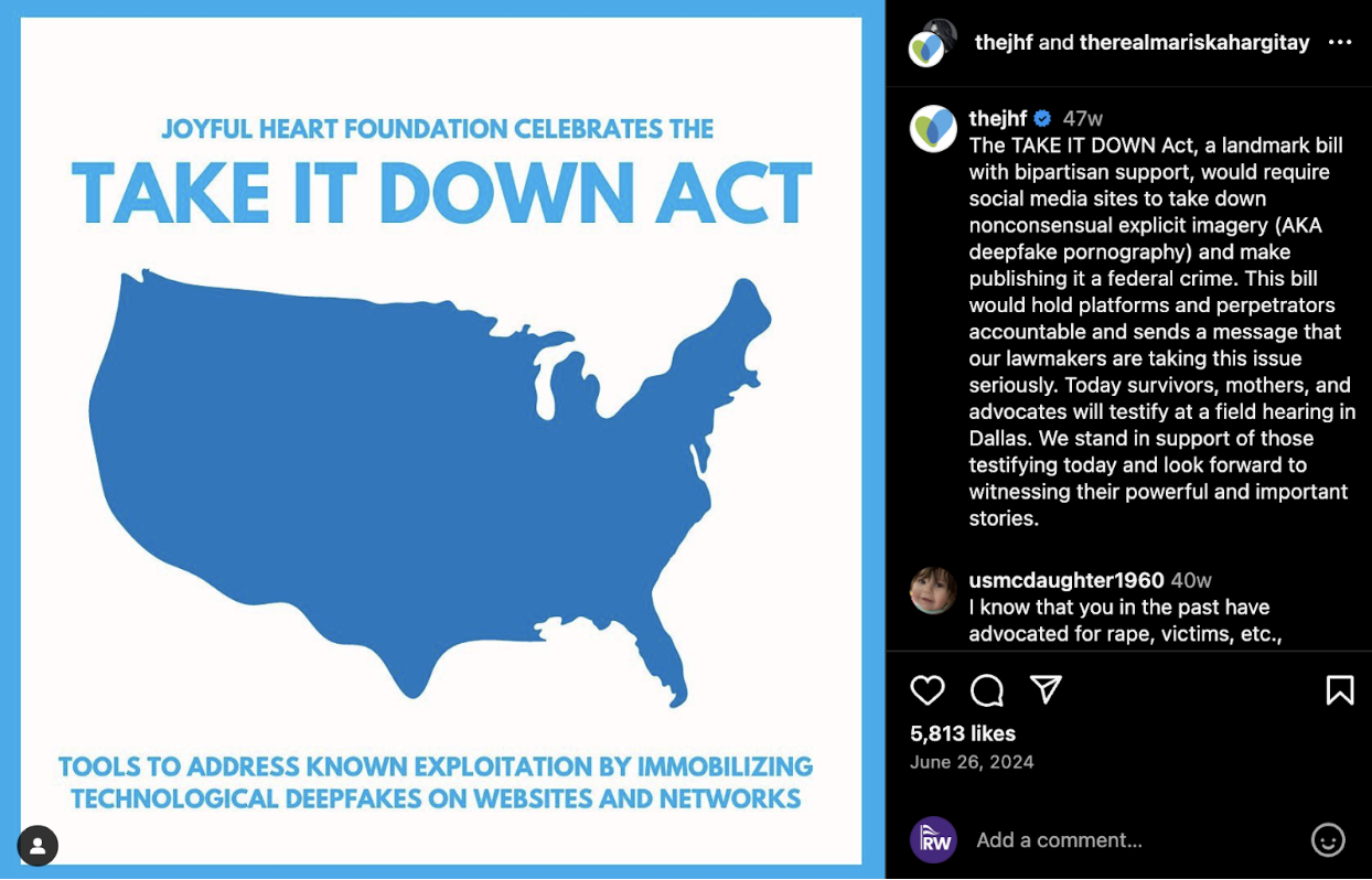 A new bill was signed into law this week by President Donald Trump. The Take It Down Act, criminalizes the non consensual distribution of intimate imagery, including AI-generated deepfakes and so-called “revenge porn.” The law requires establishing a system to remove such content within 48 hours of a verified request, though they have one year to implement these systems