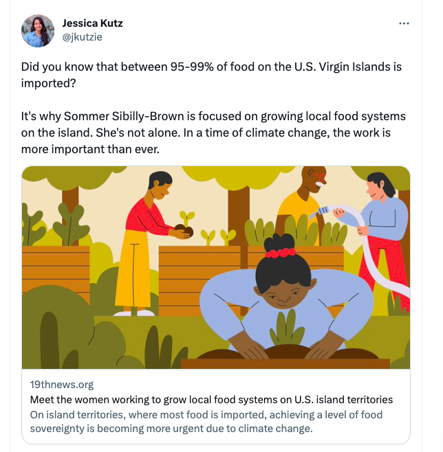 Jessica Kutz from The 19th wrote a great piece on women in the U.S. Island Territories and their efforts to bolster food sovereignty in these territories. This story is an important reminder how these territoriesdon’t have voting power, yet their citizens are expected to pay taxes and serve in military despite the lack of representation.