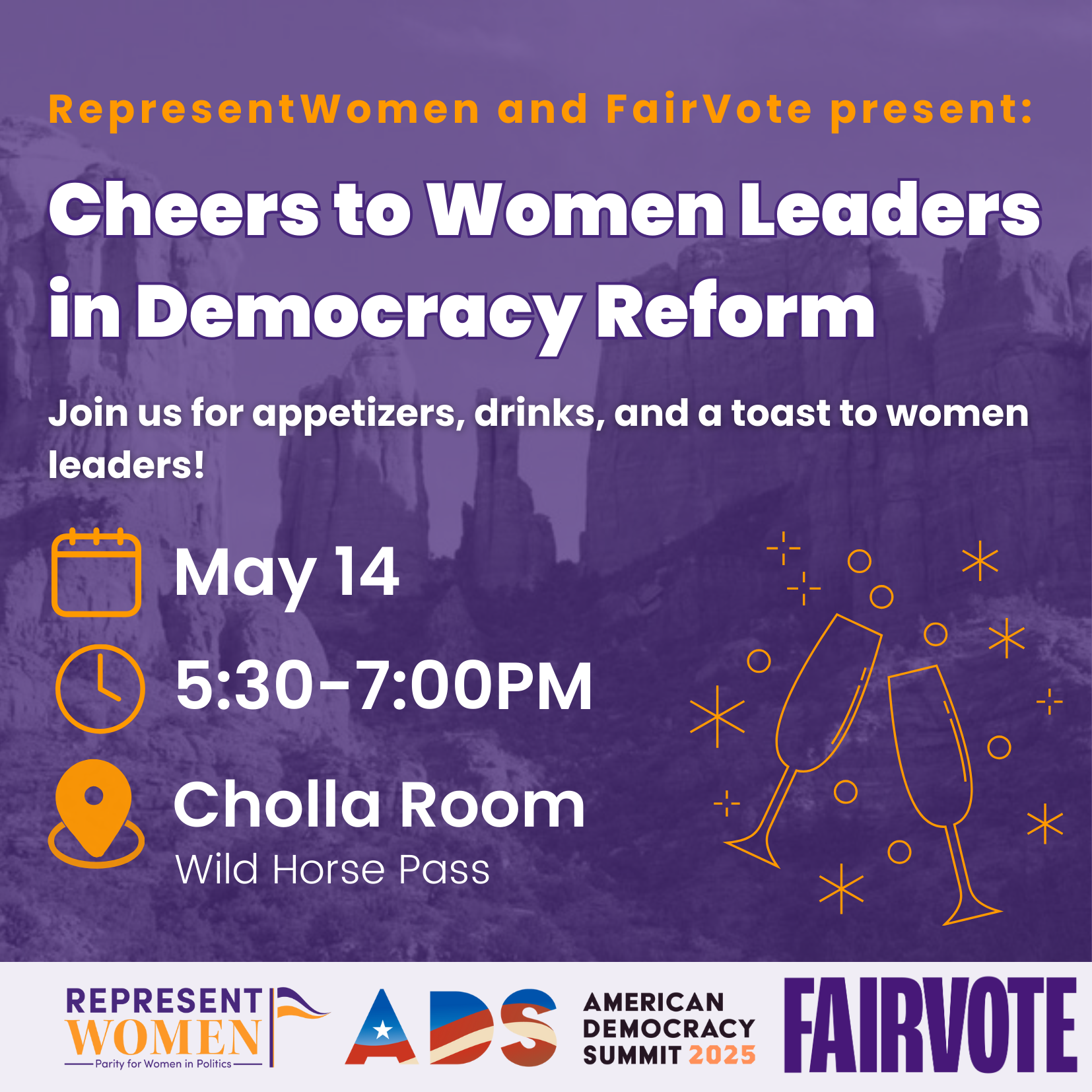 The American Democracy Summit, which brings together democracy advocates & champions from across the country to build relationships & discuss strategy, will be held in Phoenix, AZ, from May 14-16. Please use this link to register for the conference. The RepresentWomen team has organized a panel at 4 pm on May 14th, along with allies Vote Mama & Vote Run Lead, to discuss strategies for building women’s power! We are also hosting a happy hour that same day – May 14th from 5:30 to 7 pm – please use this link to register for the reception – we would love to have you join us!