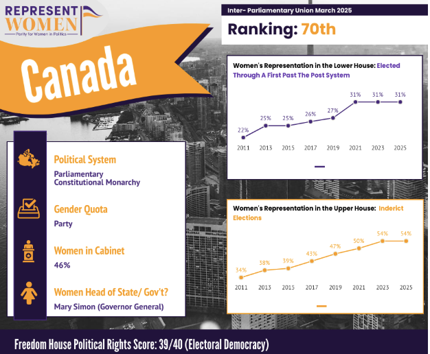 Unfortunately, women’s power may not extend toward representation gains. CBC News featured analysis from Equal Voice, a Canadian nonprofit dedicated to improving gender representation in Canadian politics, on a sharp drop in women’s candidacies from 2021, when women won 30.5 percent of seats.
