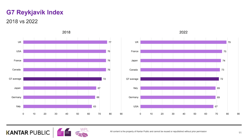 The annual Reykjavik Index for Leadership data shows a widespread lack of progress and in some areas regression, in G7 countries and others, on the perception of women and men being equally suitable for leadership. Some areas of the Index, the first measure of perceived suitability of women and men for leadership, have dropped to levels lower than were first measured when the Index was launched by Kantar Public and Women Political Leaders in 2018.