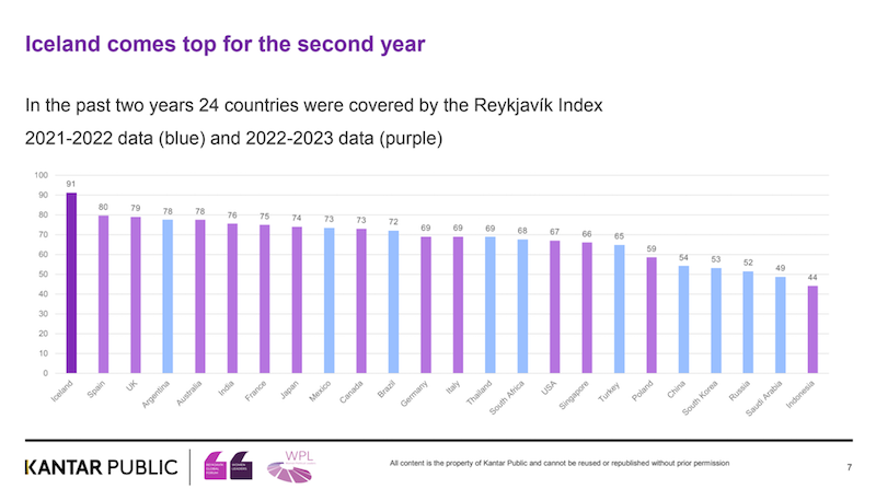 “When the Reykjavík Index for Leadership was launched five years ago at the Forum, we acknowledged that progress in equality for women was far from guaranteed,” Kantar Public CEO Harrison said. “What this year’s research tells us is that governments, employers, academic institutions and communities need to double down on collective action – not just for women living and working around the world today – but for future generations.”