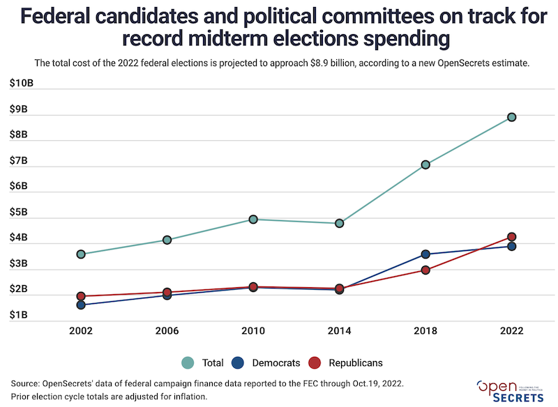 Based on data reported to the Federal Election Commission through Nov. 1, just over $7.5 billion has already been spent on federal 2022 midterm elections. Federal candidates and political committees projected to spend $8.9 billion total on the 2022 midterm election.