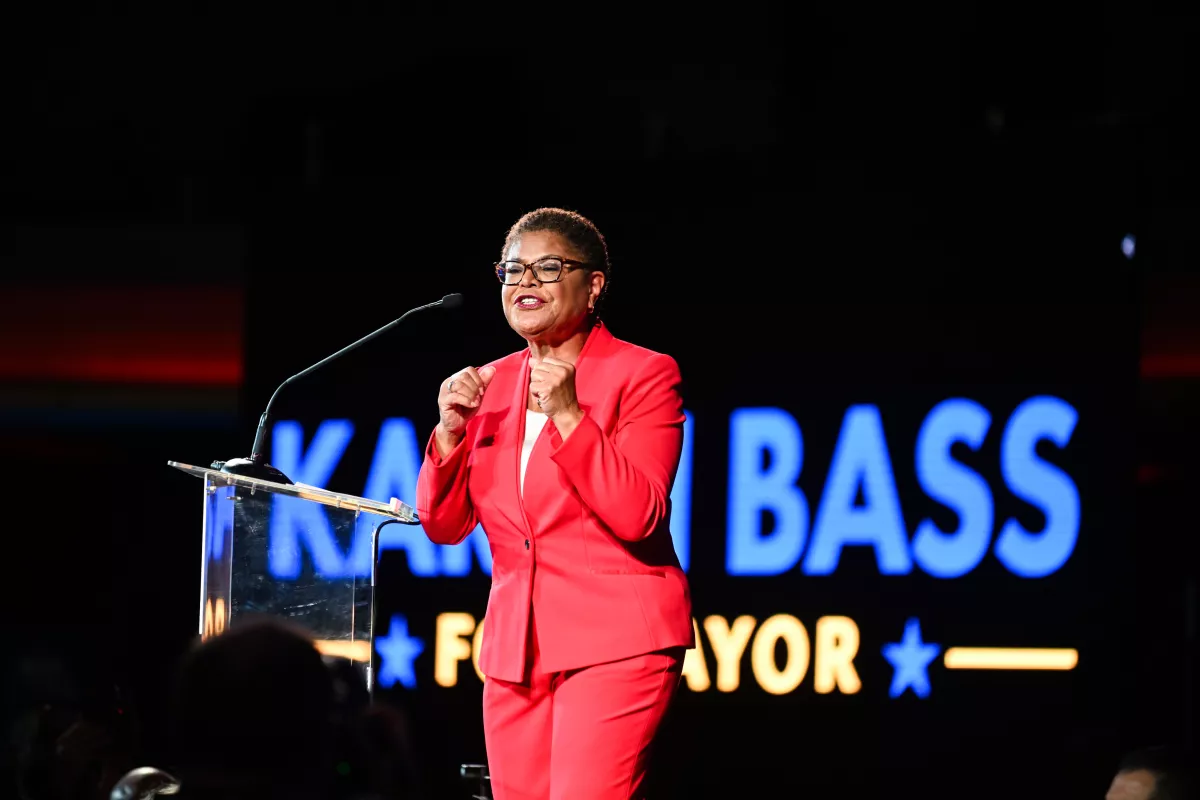 Karen Bass, speaking to supporters on election night. Source: LA Times