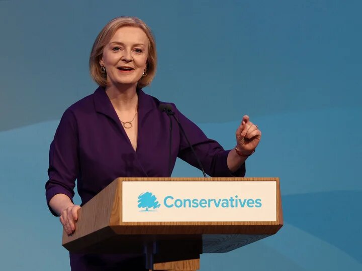 Prime Minister Liz Truss standing at the podium. Source:Refinery29