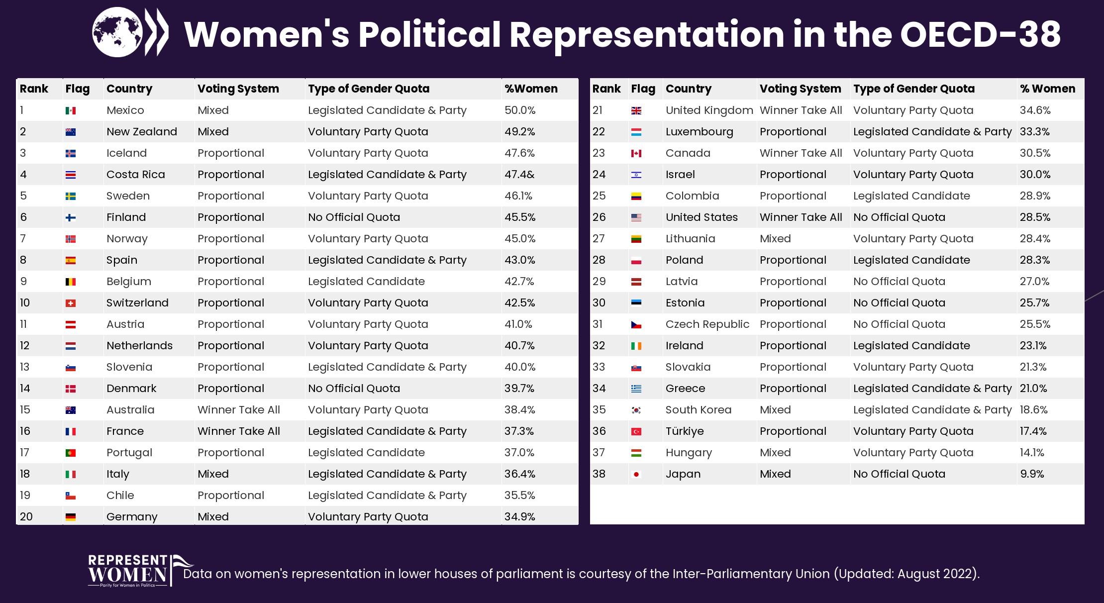What do these three countries all have in common? Looking at the chart above which tracks women's representation in the OECD, courtesy of RepresentWomen, these three nations all use proportional voting systems. Every country in the top 14 uses proportional or mixed voting systems and the vast majority of these have some type of gender quotas in place.