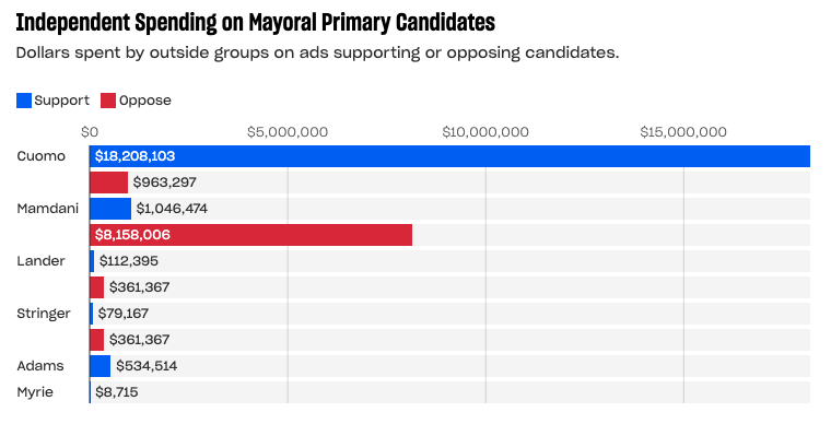 That’s a pattern I’ve observed in a series of competitive major elections with RCV. As a candidate, I’d prefer to have more money than not, but it’s not enough in itself. Candidates perform best when they and their campaign team get out to meet voters, speak at local events, earn endorsements, and build relationships. Recognizing his significant lead before spending any money, we’ll soon see how Cuomo’s substantial IE spending advantage translates into impact.