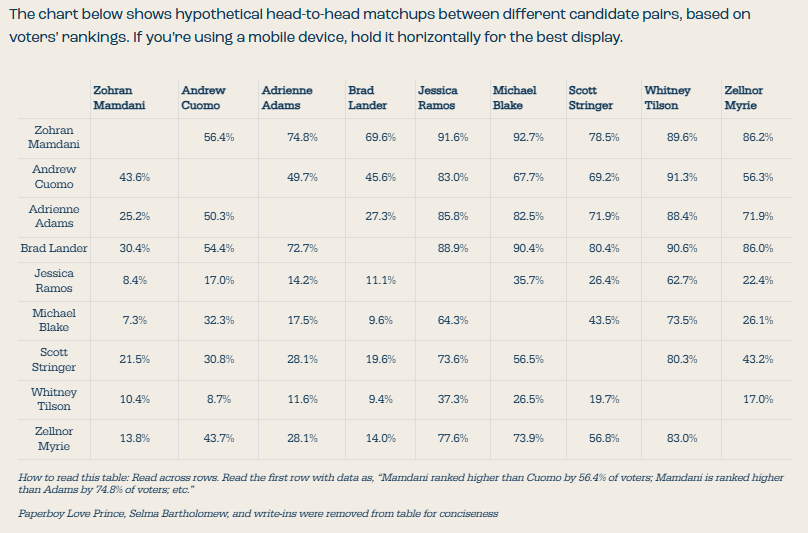 Mamdani does well in this comparison. He defeats Andrew Cuomo by 56.4% to 43.7% and defeats every other candidate by at least 69.6% to 31.4%. But what jumped out for me was what this comparison showed for City Council speaker Adrienne Adams, who entered the race late and struggled to gain traction. While earning only 4.1% of first choices compared to Cuomo's 36.2%, when matched against Cuomo head to head, she defeated him, and, as reported by the New York Times, is ranked by 54% of voters as compared to only 45.7% who ranked Cuomo. Barely half of Cuomo’s voters ranked another candidate, as compared to more than 90% of backers of every other candidate.