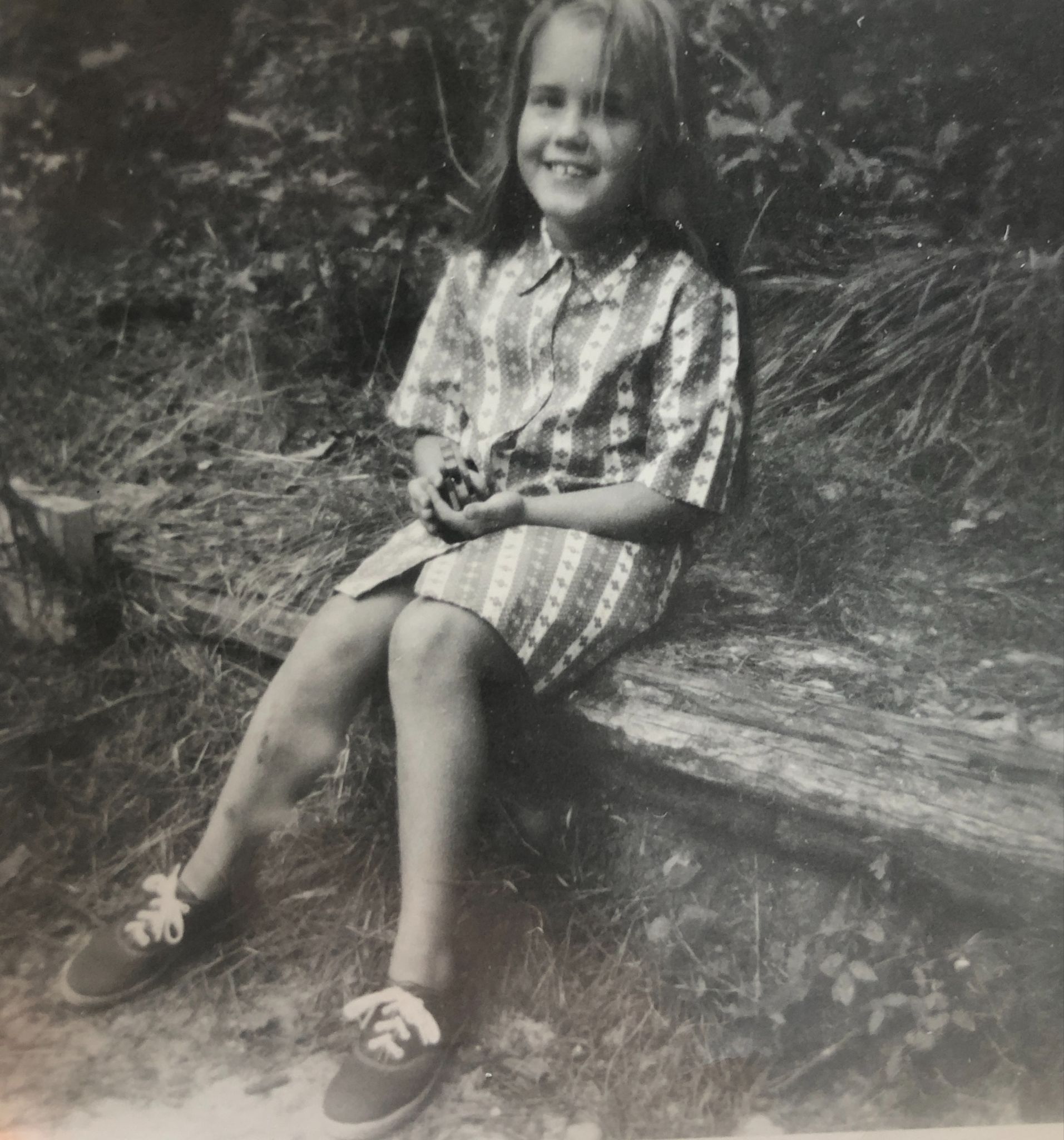 In new red Keds & my favorite orange & white striped dress at our family cabin in the Pine Barrens in 1970 or thereabouts