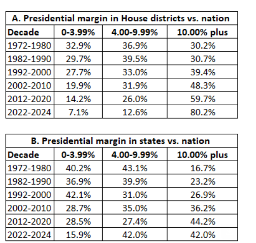 Before your eyes glaze over at these numbers from Larry Sabato’s Crystal Ball, please consider their implications! The first chart shows that we now are seeing a near perfect correlation between which party’s presidential candidate won a state or congressional district and which party’s Senate or congressional candidate wins in the midterm two years later – changing from more than half of states on average electing a “minority party” U.S. Senators before 1996 to only about 10% doing so since 2014, with a similarly stark shift in U.S. House races. Just as importantly, the second chart shows the level of “partisan sorting” into partisan supermajorities in most of the nation, exacerbated by gerrymandering that has sharply reduced competitive states and districts based on that all-important presidential vote share