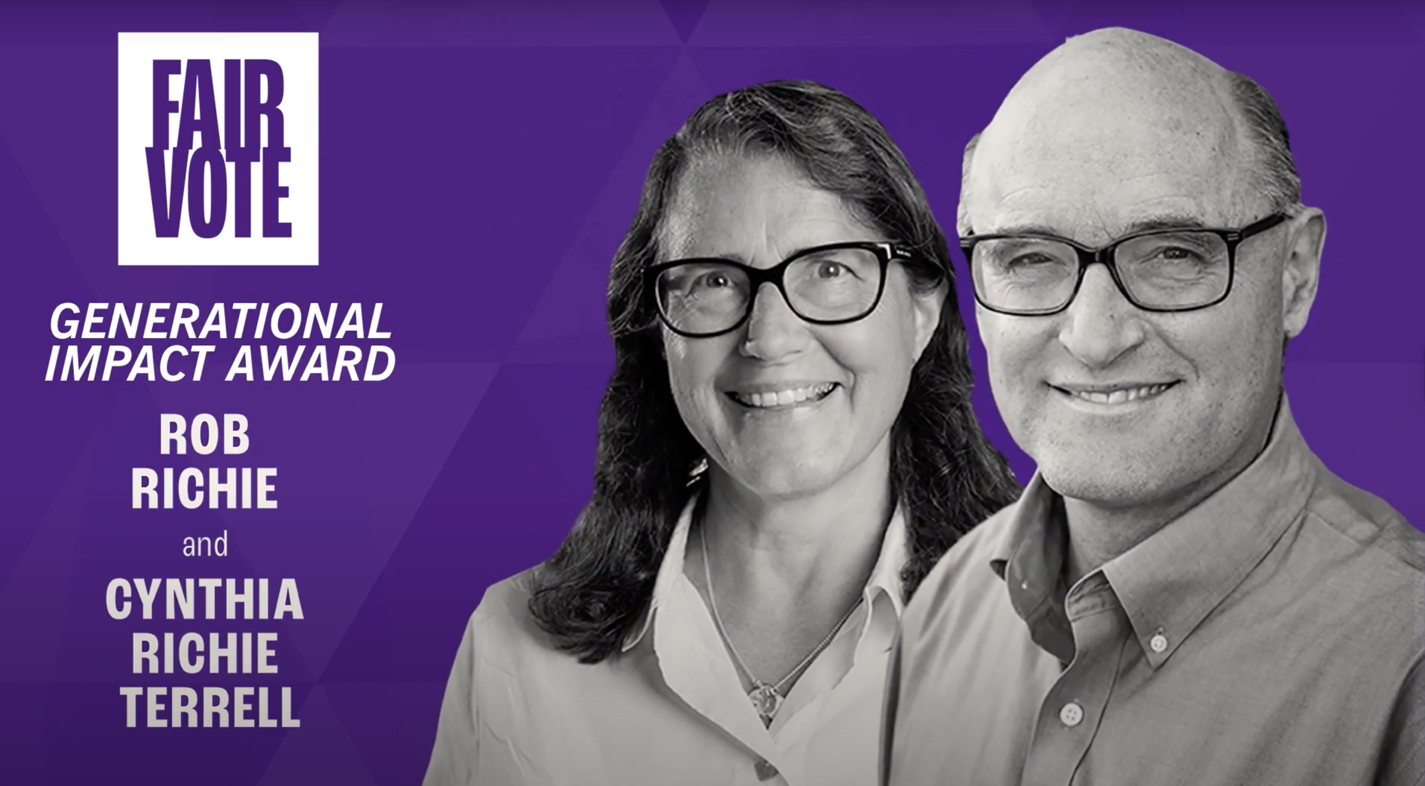 FairVote honors Rob Richie and Cynthia Richie Terrell with the Generational Impact Award for their pioneering work advancing ranked choice voting and democracy reform across the United States.