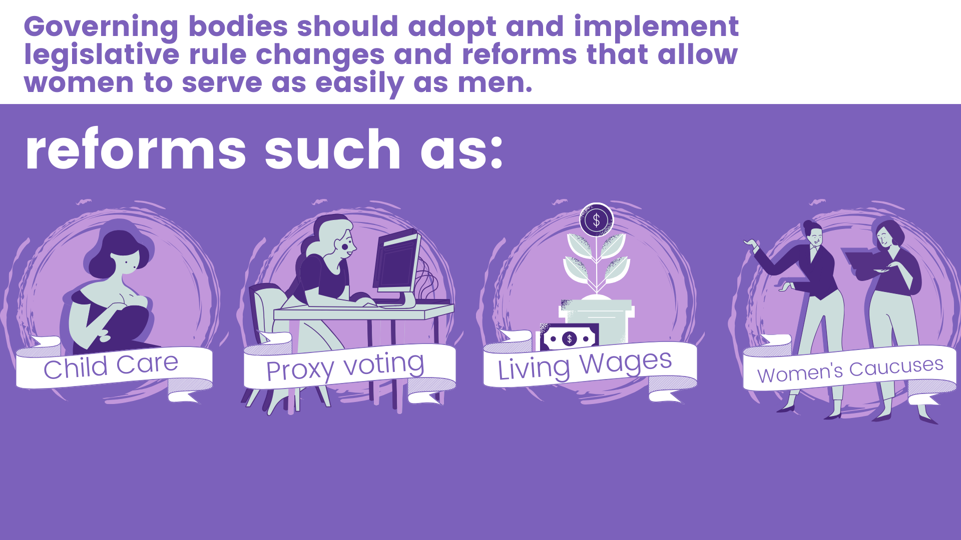 RepresentWomen imagines a modern governmental workplace where more women officeholders can thrive. To achieve this, legislative bodies should enact the following internal process reforms:
