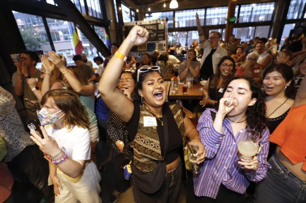 The crowd reacts as results come in for city attorney candidate Erika Evans, incumbent Seattle City Councilmember Alexis Rinck, and Seattle City Council candidate Dionne Foster at Stoup Brewing in Seattle. Source: The Seattle Times