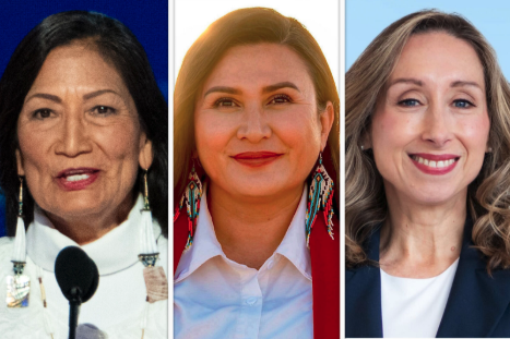 Deb Haaland (left), JoAnna Mendoza (center), and Kaela Berg (right) are among the Democratic women from blue-collar backgrounds running for office in 2026. Source: Rollcall