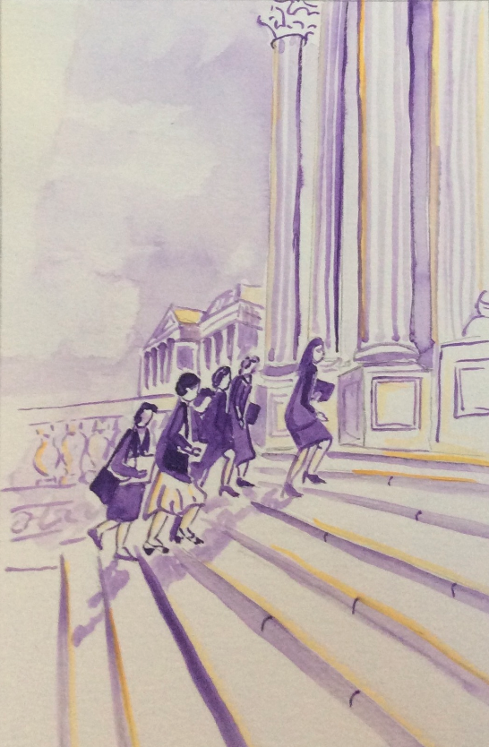 Watercolor painting depicting six of the congresswomen who marched up the Capitol steps in 1991 to demand Anita Hill be allowed to testify. In total, seven Representatives and Delegate Eleanor Holmes Norton took part — a moment Rep. Louise Slaughter later called “the female Iwo Jima.” Source: Melanie Humble