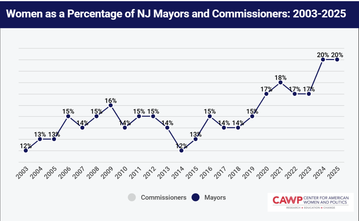 Women made virtually no gains in public office in New Jersey from 2024 to 2025, according to the latest New Jersey County Report Card from the Center for American Women and Politics (CAWP), a unit of the Eagleton Institute of Politics at Rutgers University. The number of women mayors serving in the Garden State increased by just two, the number of women serving on municipal councils increased by just 18, and the number of women serving on county commissions was entirely unchanged.