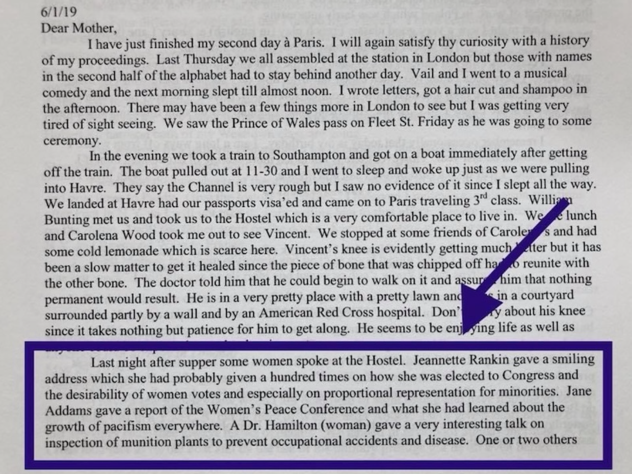 Letter from my great uncle to his mother about the evening he spent with his brother, my grandfather, and Jeannette Rankin in Paris in 1919